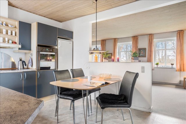 Boligen byder også på en stue med gulvvarme og et køkken, hvor I snildt kan sidde fire-fem personer omkring et spisebord. Boligen indeholder også på en stor entré, badeværelse med gulvvarme og et køligt viktualierum.