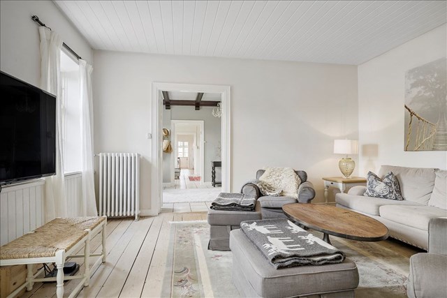 Velkommen til et lyst og lækkert stuehus, der er en del af en renoveret trelænget ejendom fra 1863, der også har hestestald og værkstedsbygning.